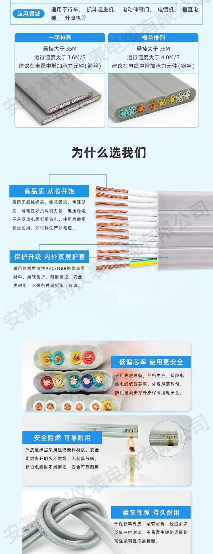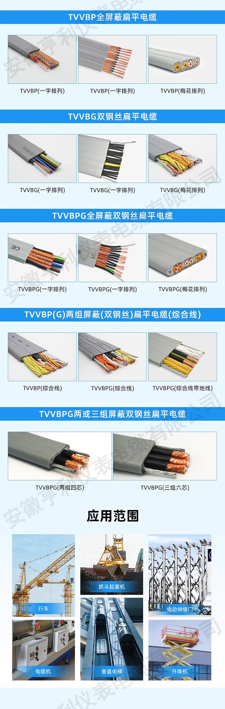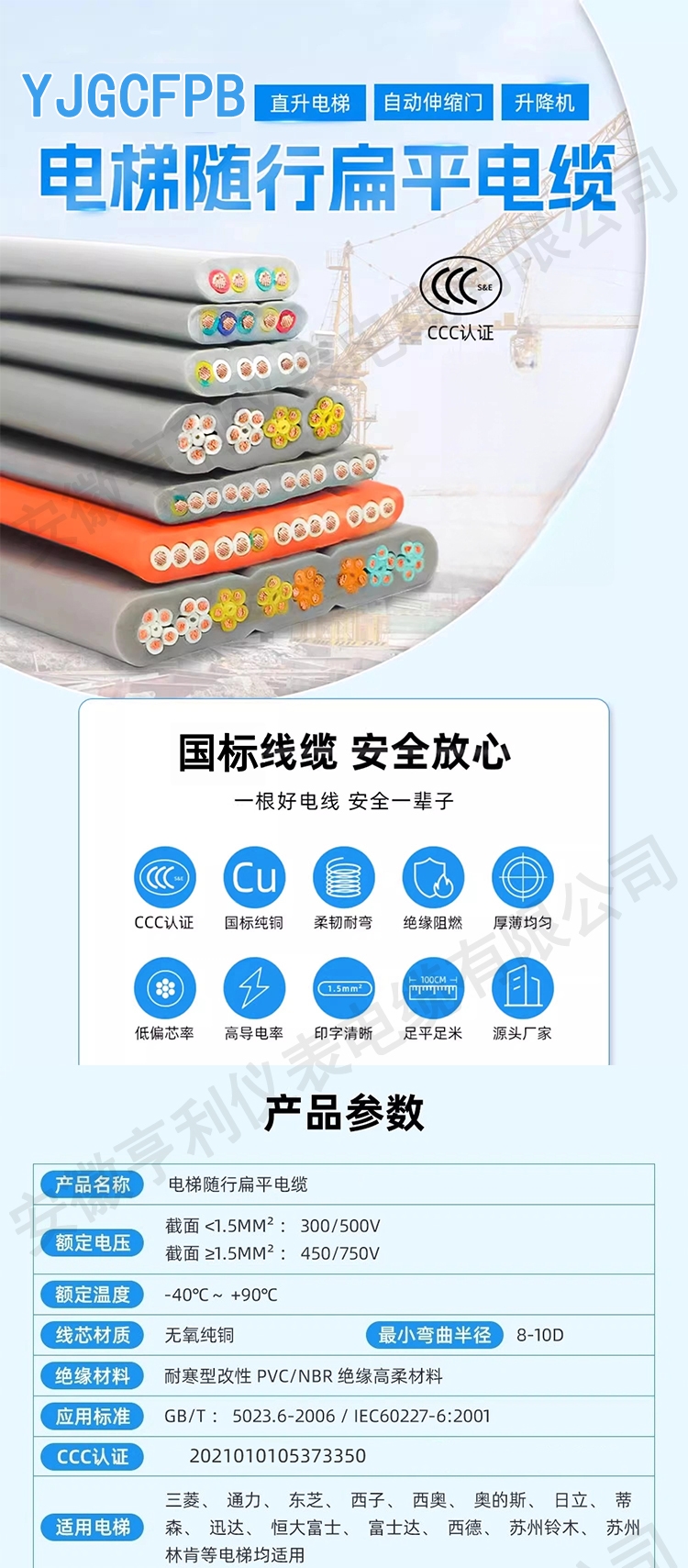 高压扁电缆导体长期允许工作温度腈复合物为七十度,硅橡胶为一百八十度,电缆最小弯曲半径为电缆短边直径的十倍。该产品主要用于运输、机械、电气、矿山、等行业各种移动动力装置的电源连接及控制信号照明等。产品品种、规格及型号的组成意义YFFB系列具体规格见电缆表面的标志。电缆敷设环境温度应不得低于零下四十度,丁晴氯乙烯聚合物电缆不得高于七十度,硅橡胶电缆不得高于一百八十度。电缆不应该长期放在水中,丁晴氯乙烯聚合物电缆不应该长期在高温下 运作。电缆的额定电压应大于或等于系统额定工作电压,在直流系统中,该系 统的标准电压不大于电缆额定电压的一点五倍;系统的工作电压应不大于额定电压的一点一倍。电缆敷设安装过程,放弃物对环境不构成不良的影响。但应及时对放弃 物进行清理。技术特性:导体单线为裸铜导体。电缆外护套橡皮采用丁晴氯乙烯聚合物或硅橡胶,具有耐热辐射、耐 寒、耐酸碱及腐蚀性气体、防水等特性。P型电缆绝缘具有屏蔽功能。电缆外表光滑,无裂口、起砣、硫化胶粒等现象。电缆的敷设、安装:电缆敷设安装应由取得资格证书的有实际工作经验的人员承担。电缆敷设应采用符合要求的专用设备工具如放线架、导轮,可采用 端头牵引,机械输送,人工辅助引导的同步敷设的方式。电缆在敷设时应采取有效措施,防止电缆在地面、沟壁、管口、机具上的擦伤,保证电缆在敷设时的完好性。在敷设中,电缆不允许扭曲,如果造成扭曲应顺着扭曲方向解除。电缆不能直埋在地下敷设,或浸泡在水沟中。电缆运输、贮存、装卸、保管、现场放置等注意事项。产品验收及检查:产品到达目的地后,用户应及时进行检查验收。产品拆包装时不应该损伤电缆表面护套层。检查内容:电缆型号、规格、长度是否与货单一致。检查电缆外表是否完好无损,有无裂口等不良现象,检查电缆外径是 否符合电缆参数,外径是否均匀。电缆盘是否有明显的变形、扭曲,电缆端头是否封帽。产品合格证,每盘、每件一份,质量保证书一份,若用户需要,产品使用说明书一份。绝缘材料采用高强度耐磨丁睛复合物绝缘料,绝缘应连续不断的挤包在导体上,表面应光洁圆整无缺陷。表面应光洁圆整无缺陷。电缆的安装与注意事项 电缆的敷设不能扭曲,即不可从电缆盘的某一端解开电缆,而应先旋转电缆盘将电缆展开,必要时可将电缆展开或悬挂起来。必须注意电缆的最小弯曲半径。电缆的两点都必须固定,或至少在拖链的运动端必须固定。一般电缆的移动点离拖链端部的距离应为电缆直径的三十倍。